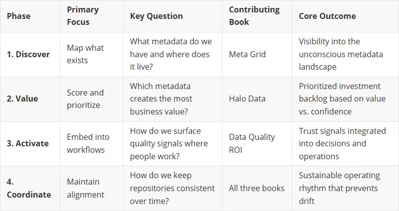 The sequence is still required - but you can emphasize one phase while laying groundwork for others. An organization drowning in undocumented metadata cannot meaningfully score value. An organization with clear CDEs but zero business engagement cannot activate without first fixing sponsorship.