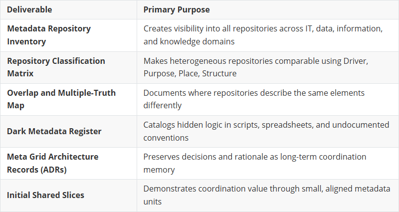 You map existing repositories, classify them, surface overlaps and contradictions, and document dark metadata that lives in scripts and spreadsheets. Without discovery, you are building on sand.